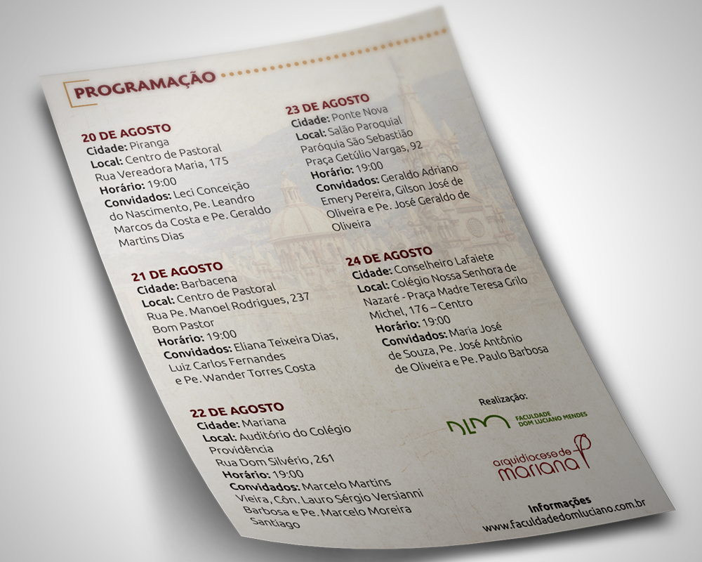 Desenvolvimento de Identidade Visual para evento da Faculdade Dom Luciano Mendes em Mariana (MG). Foram criados Logotipo, Folder, Cartaz e demais peças gráficas.