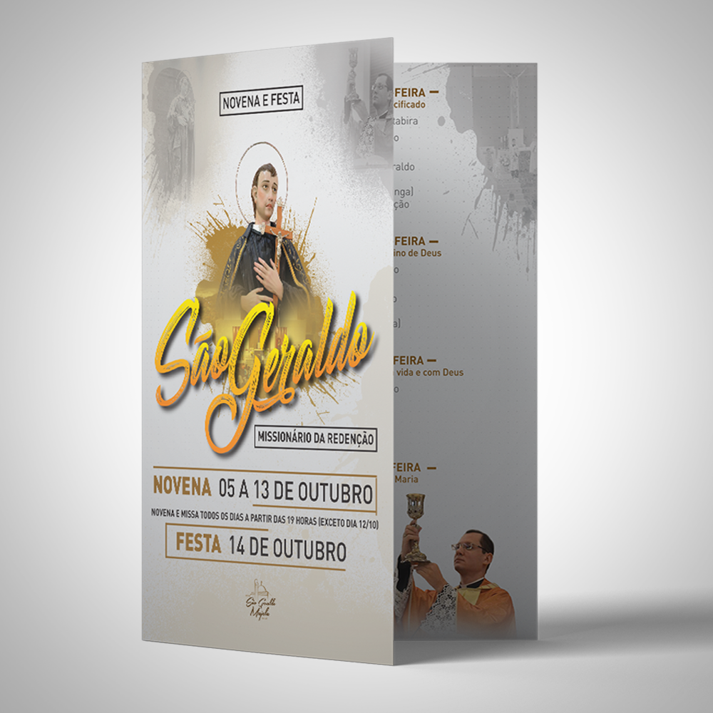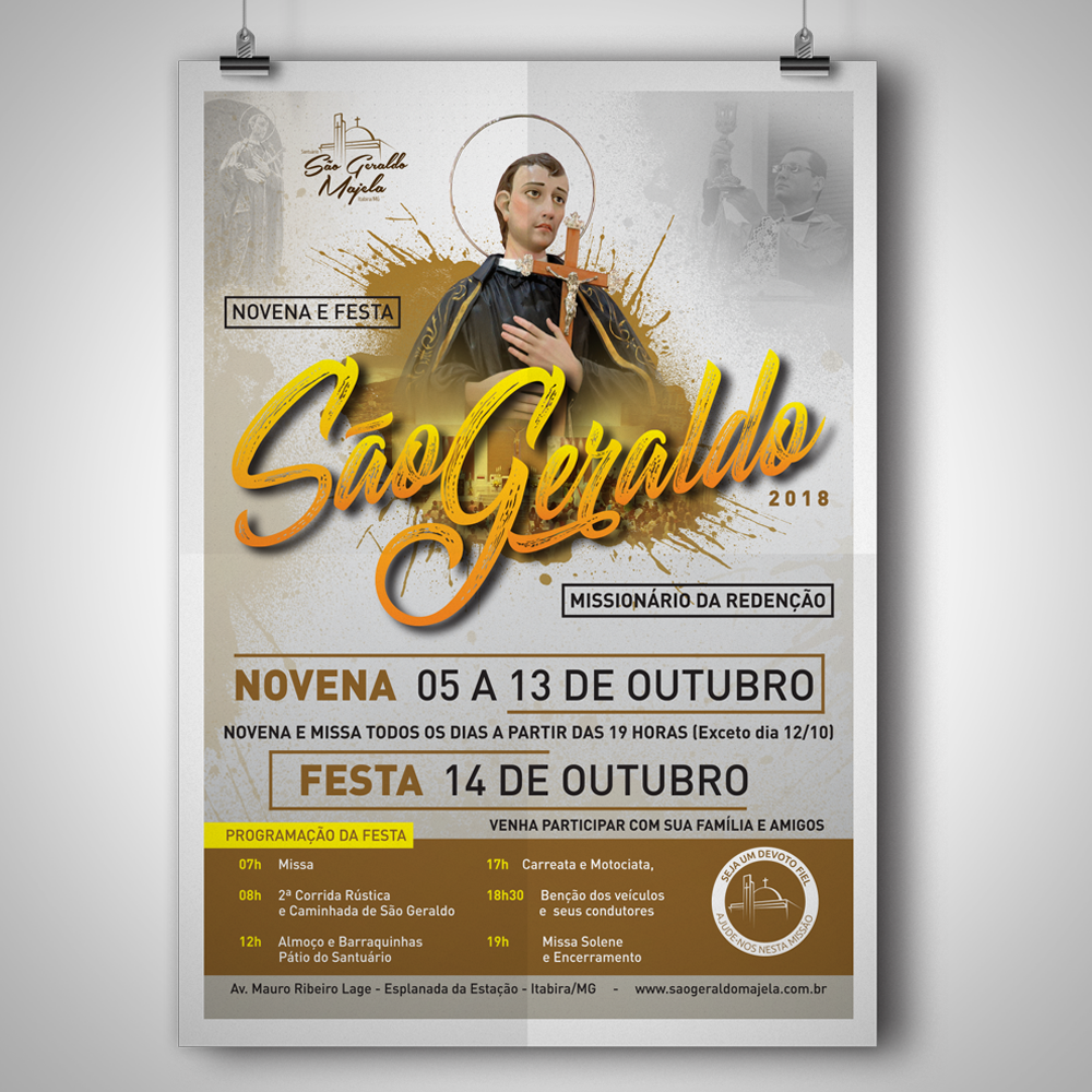 Desenvolvimento de Identidade Visual para a Novena e Festa de São Geraldo para o Santuário São Geraldo Majela em João Itabira (MG). Foram criados Logotipo, Folder, Camisa, Cartaz e demais peças gráficas.